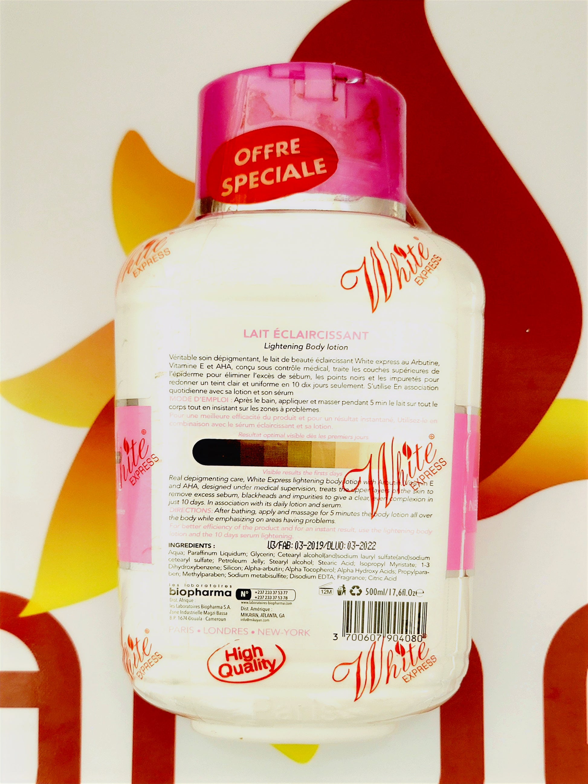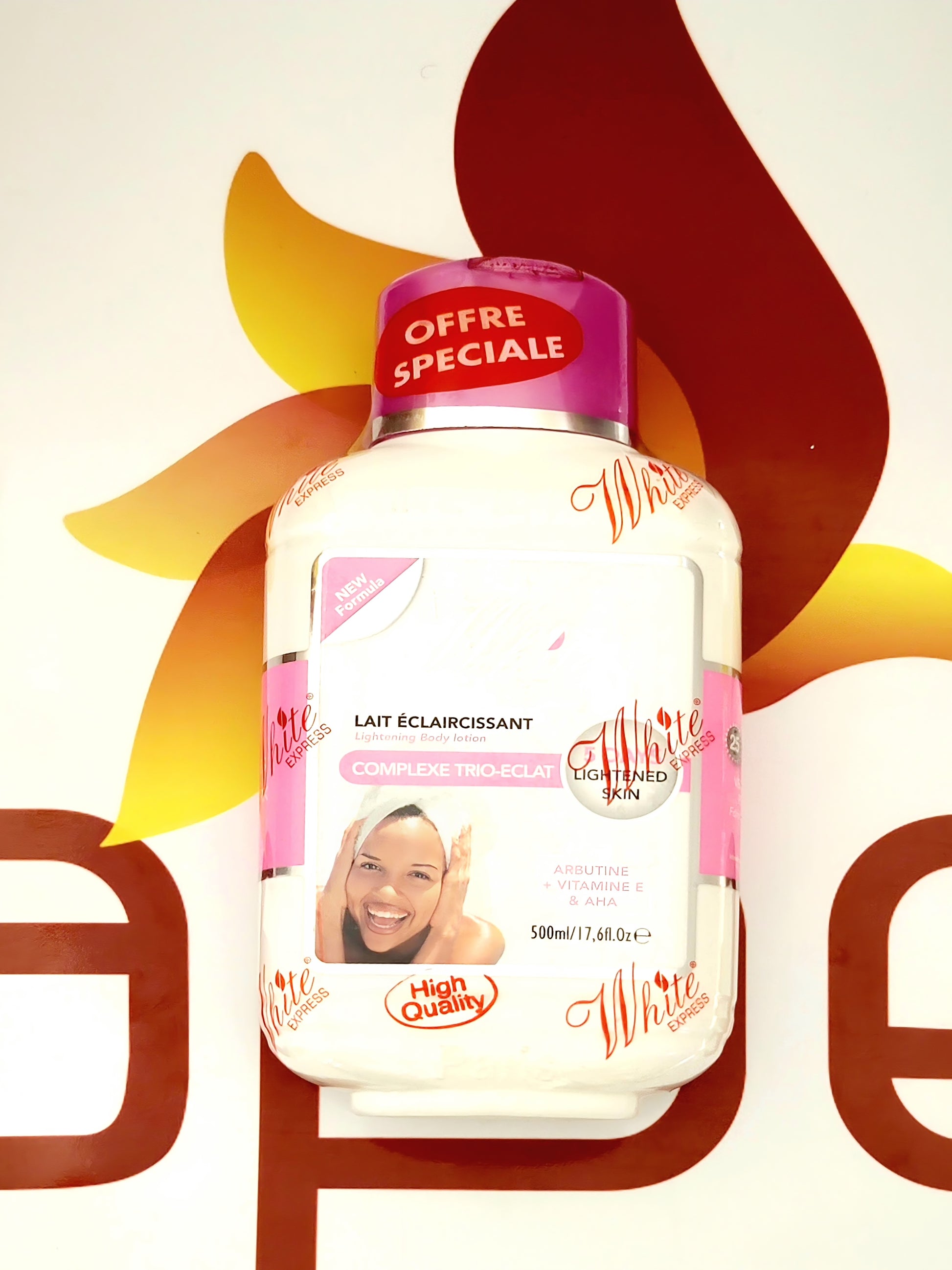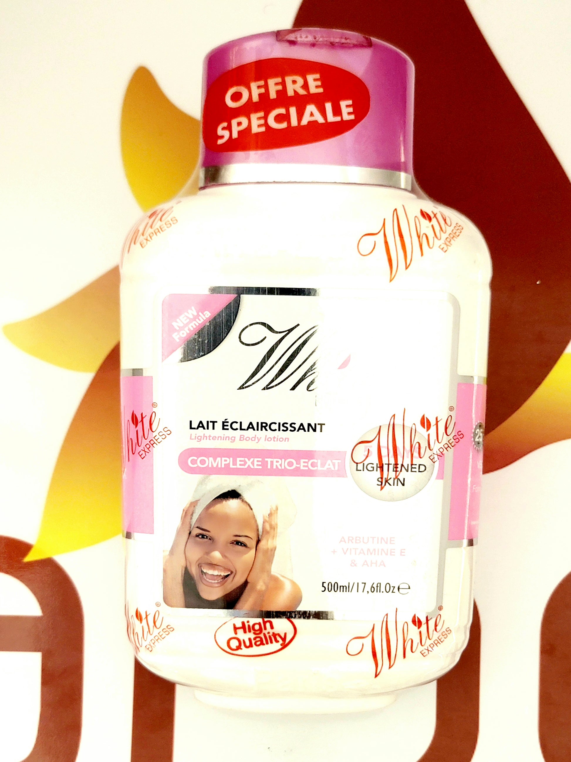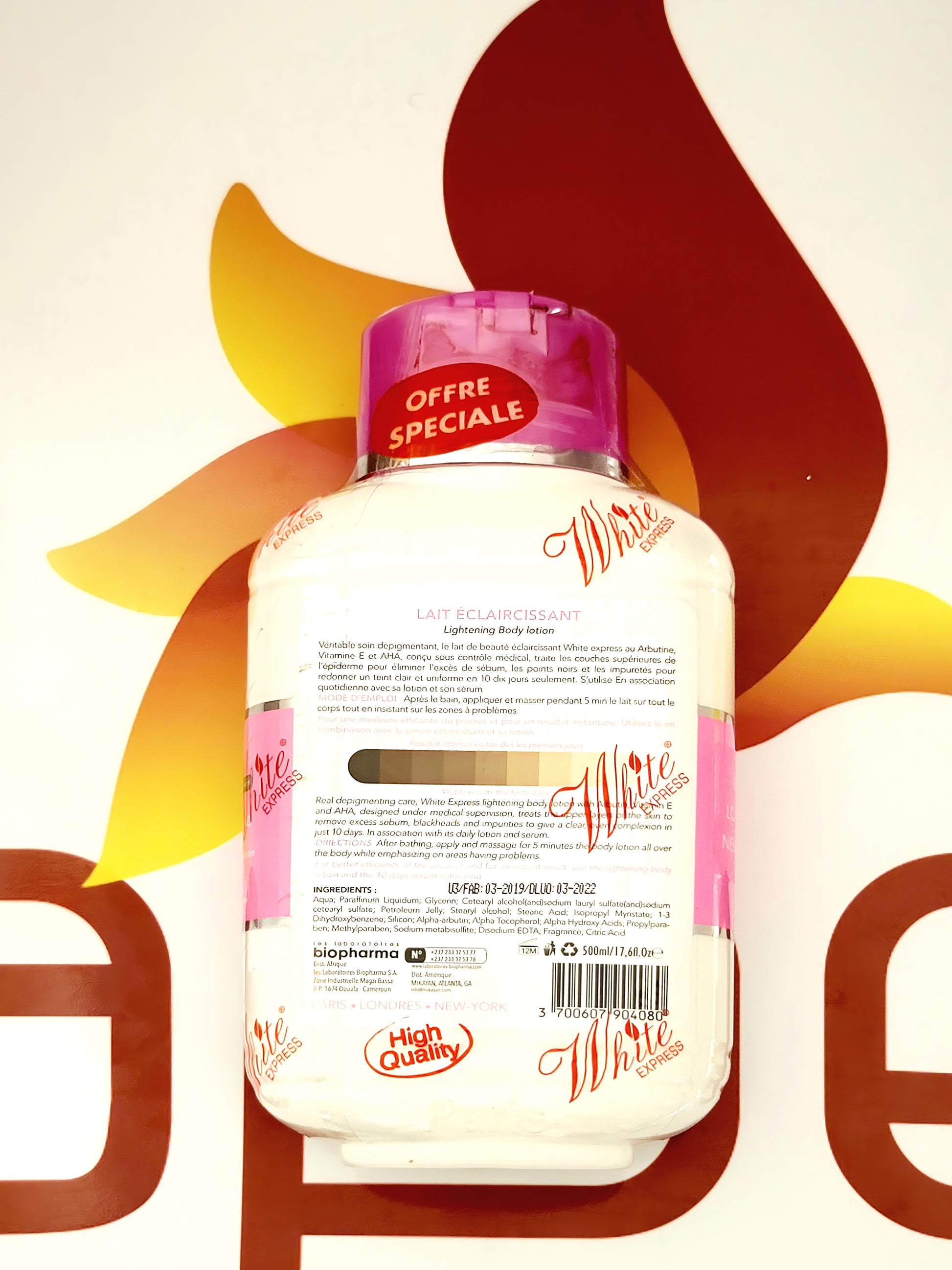 Real depigmenting care, White Express lightening body lotion with Arbutin, Vitamin E and AHA, designed under medical supervision, treats the upper layers of the skin to remove excess sebum, blackheads and impurities to give a clear, even complexion in just 10 days. In association with its daily lotion and serum. Free Shipping on all our products within the United States with USPS First Class. 500ml/17.6fl.oz